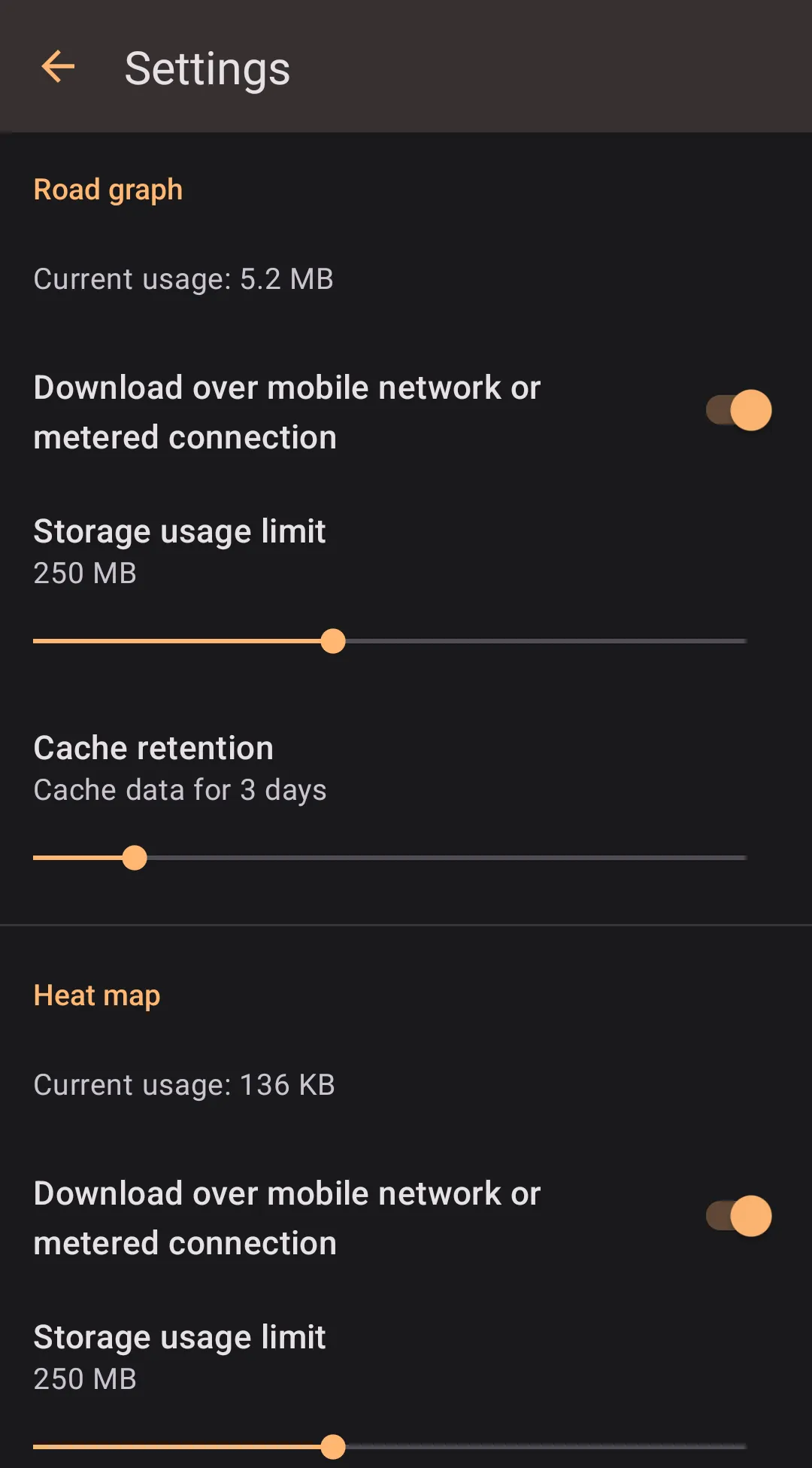 To reduce mobile data usage by Highway Radar, it caches some information it downloads. Specifically, it caches parts of the road graph, heat map, risk scores, and cameras database (if cameras provided by Highway Radar are used). Highway Radar caches data as soon as it needs to download it – that usually happens when you drive in that area.