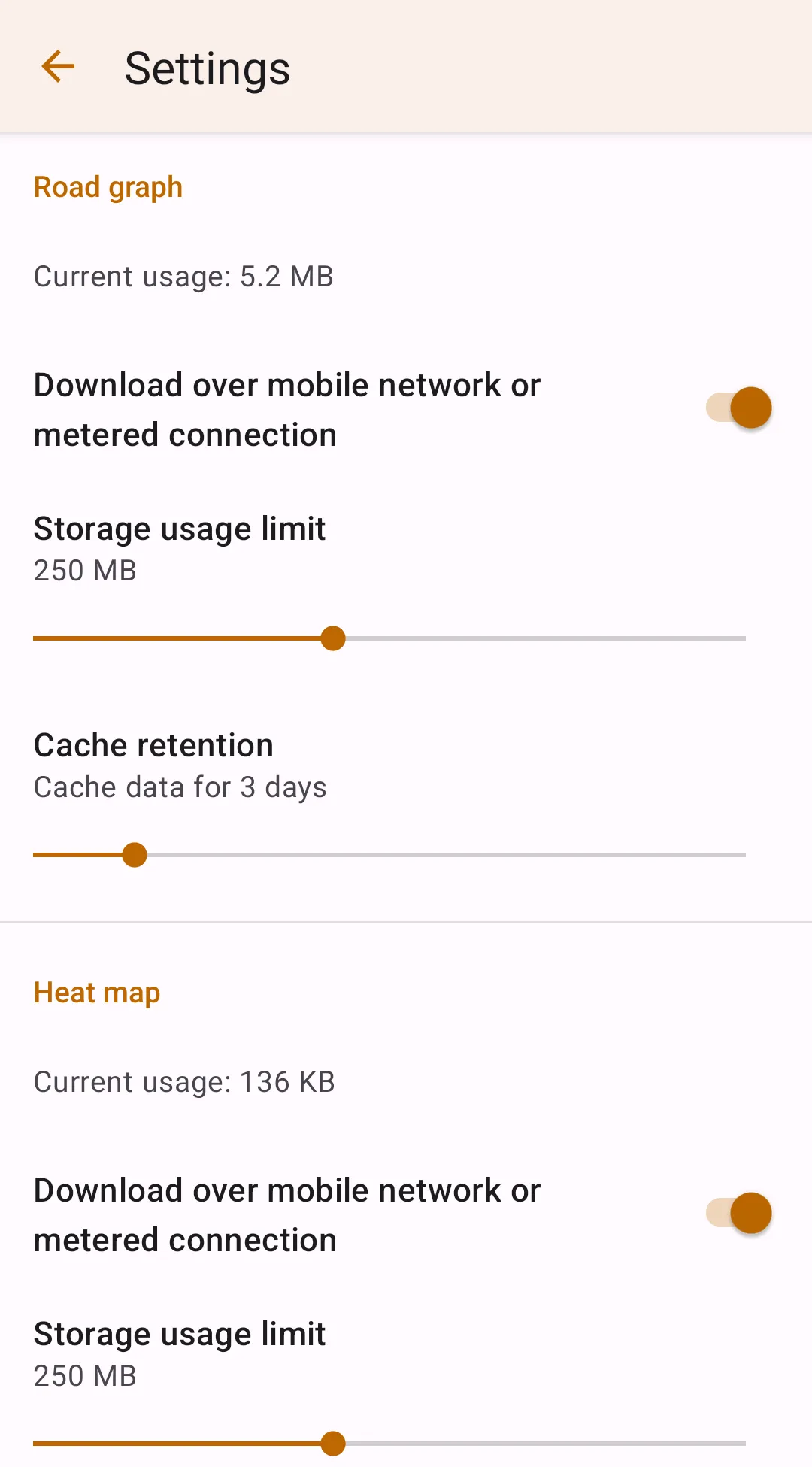 You can set the maximum size of cached data in the application's Cache and data management settings section.However, Android may remove some files from the cache when the device is low on disk space. The cache retention can also be set in the application's Cache and data management settings section. Also, the same section of the application allows you to control whether Highway Radar may download the data over the mobile network or metered internet connection.