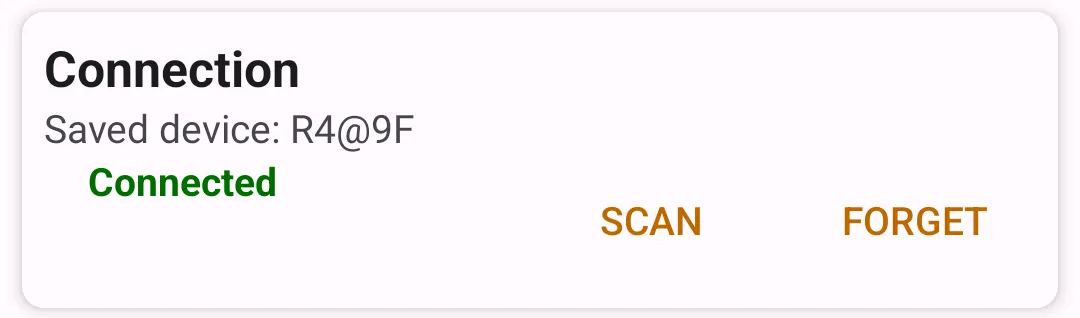 Connection displays connection status and the remembered detector name. The scan button is used to pair a new detector, and the forget button clears the currently paired one.