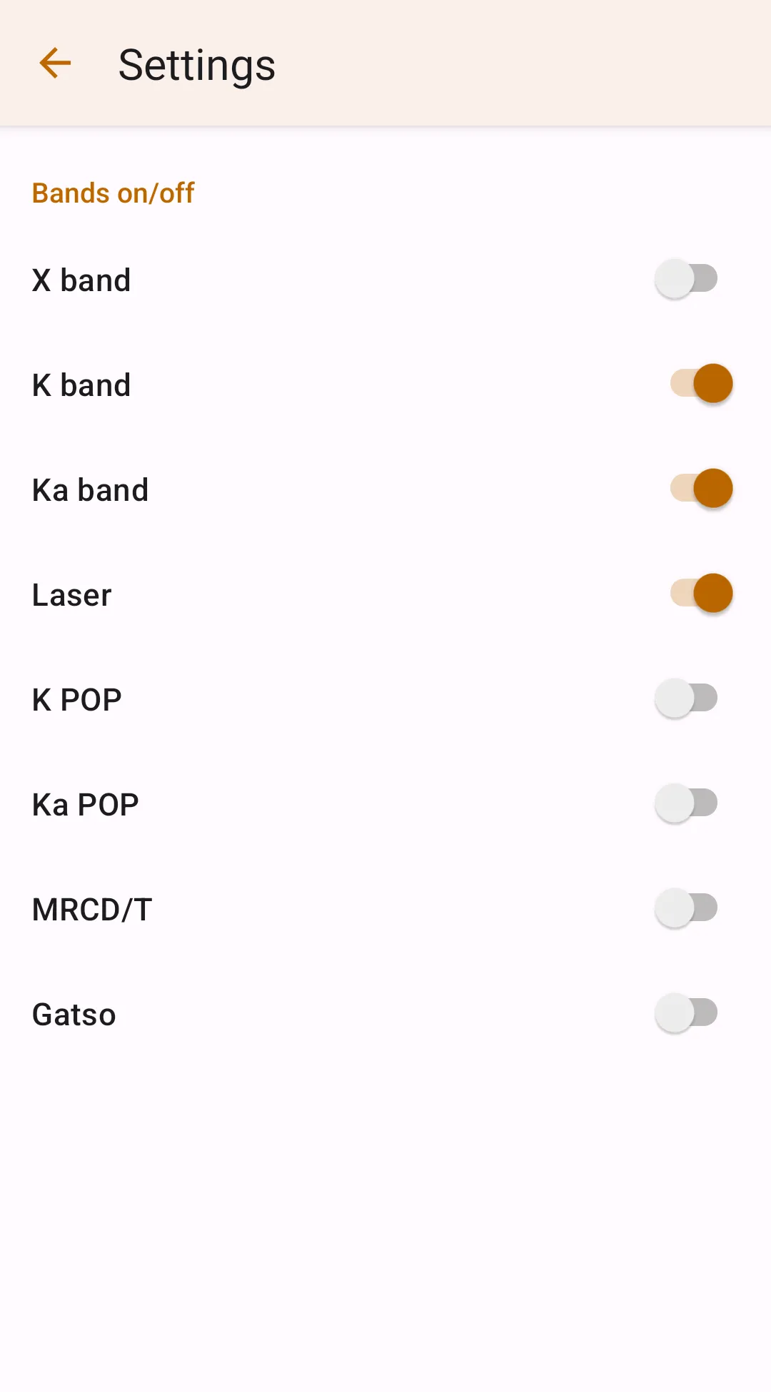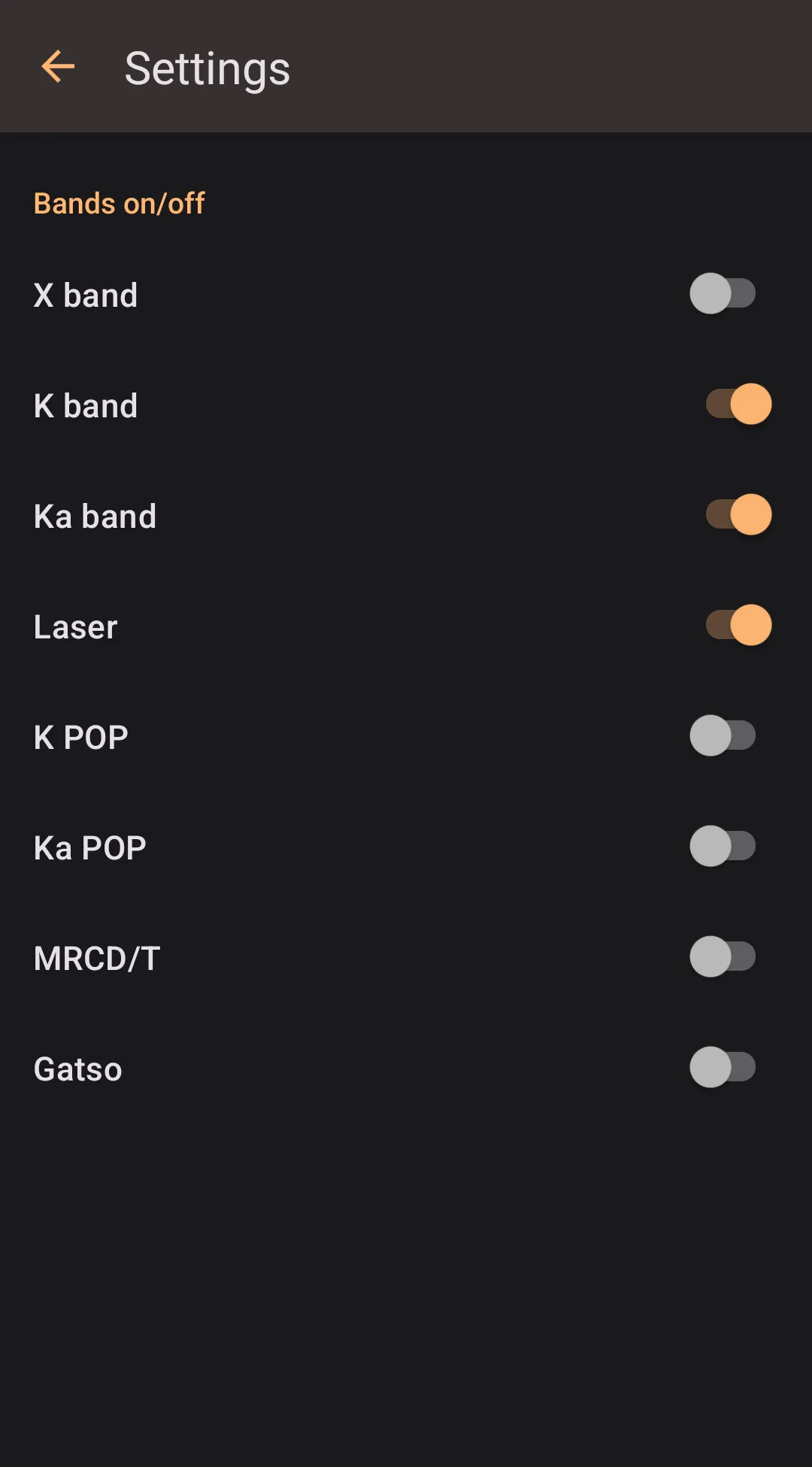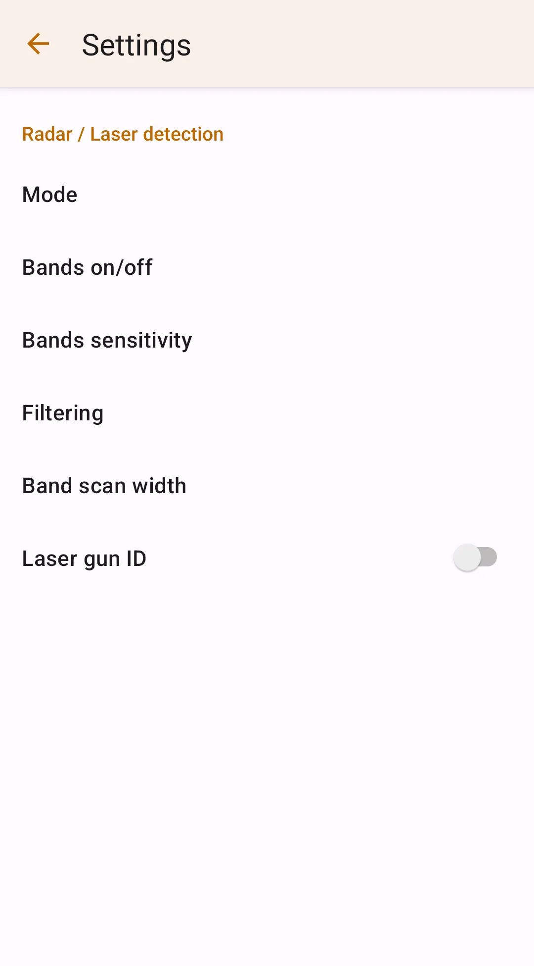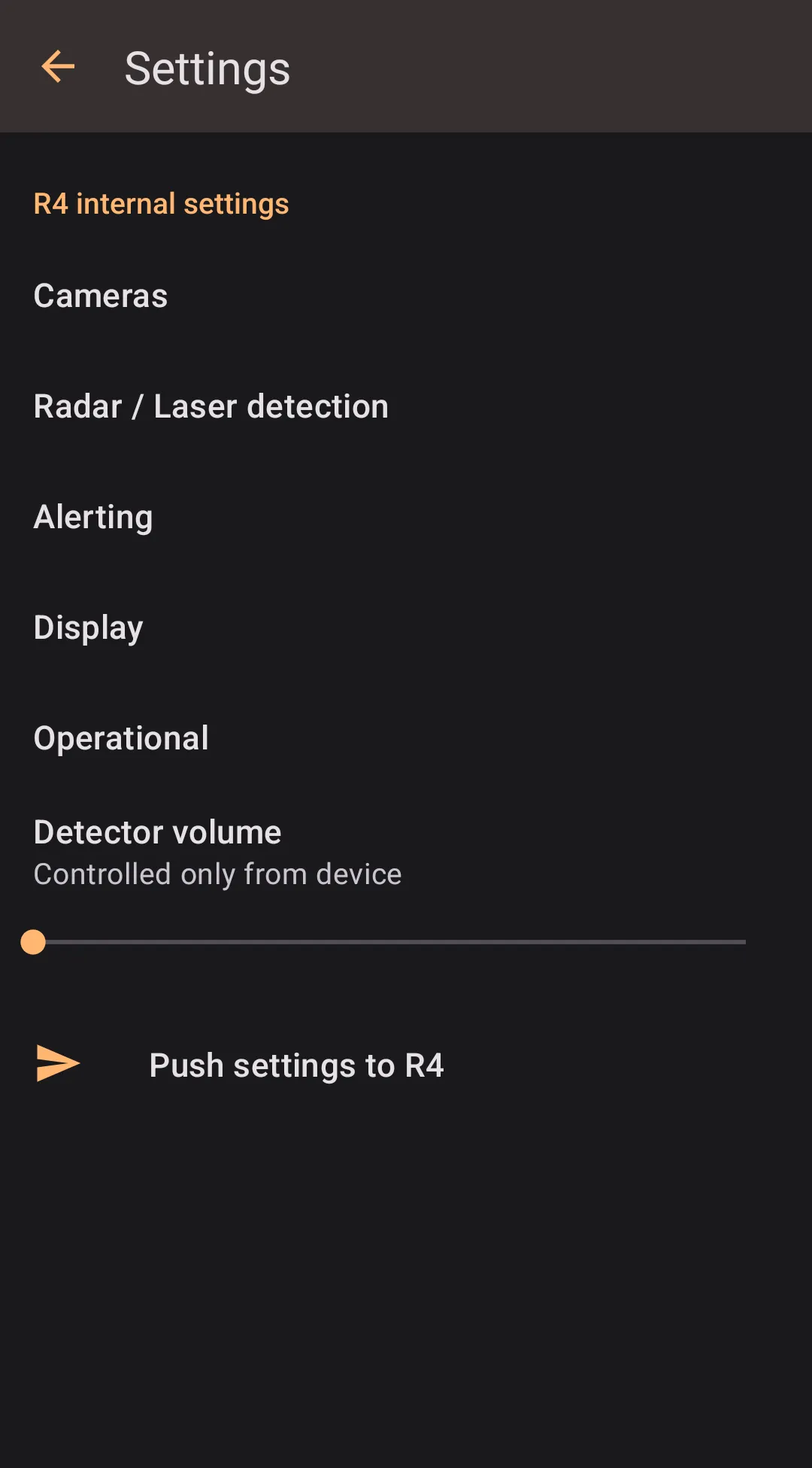One of the good benefits of R4/R8/r9 integration is managing the detector settings from a user-friendly interface on a big phone screen. To update internal detector settings, proceed to Settings → Radar detector integration → R4/R8/R8 Internal Settings and set up your desired configuration. Then, to push the settings to the detector, tap the "Push settings to R4/R8/R9" button in the internal settings menu. Another way to push settings is proceeding to the R4/R8/R9 connection manager and pressing the Local → R4 or Local → R8 or Local → R9 button in the Device Settings section.