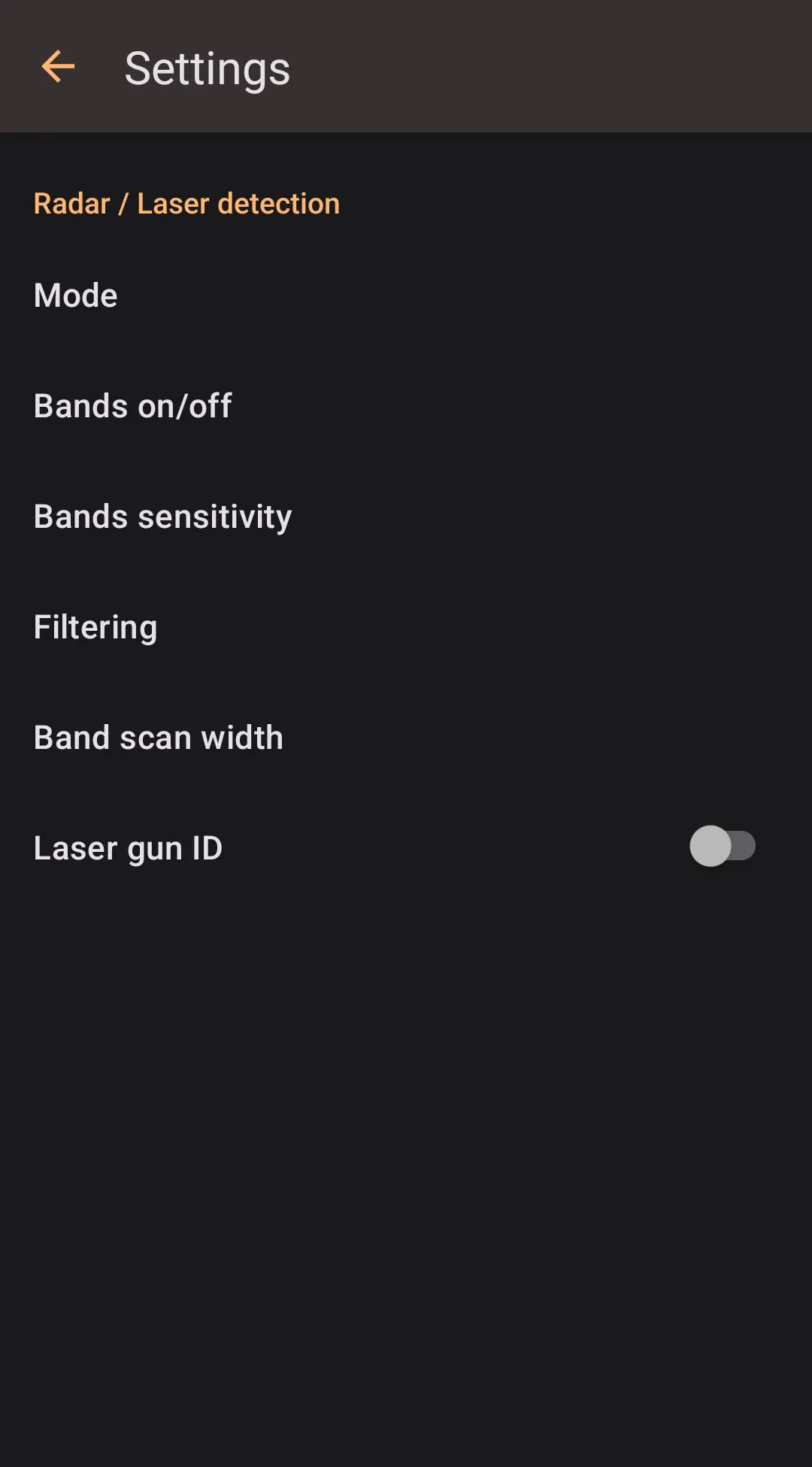 Highway Radar stores a copy of detector settings internally and supports two-way synchronization. In this section, both settings are displayed. You can change local values from the application in **`Settings → Radar detector integration → R4/R8 internal Settings``*; however, local values don't affect how the detector operates. R4 or R8 values are stored and set on the detector itself, and the detector uses them for operation.